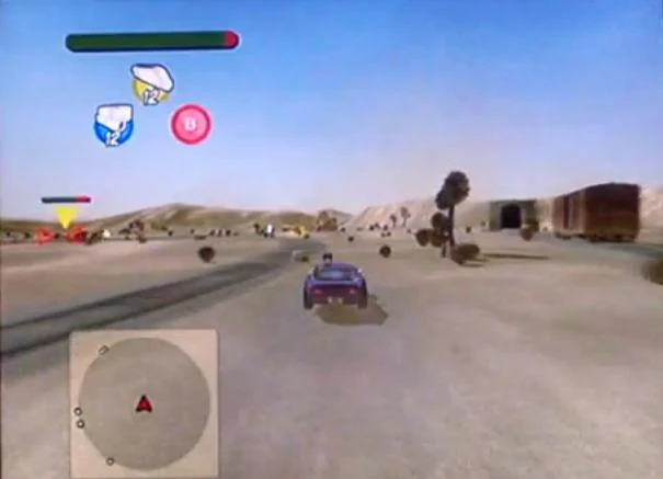 Meteor Crater (Arcade) is a stage in Vigilante 8: Arcade, which is an updated version of what seems like a combination of the Meteor Crater stage in Vigilante 8: 2nd Offense and the Canyonlands stage in the original Vigilante 8. The Meteor Crater stage seems to reside in the middle of nowhere, with uninhabited buildings and worn out roads and signs. Structures within the stage consist of tumbleweeds, dry bushes, an assortment of meteor craters and destructible bridges made of metal and dirt. Hazards within the stage include a traveling tornado that whips the player from the ground and throws them a few yards across the stage, causing serious damage, and lasers that seem to spawn from no where that shoot the ground around each meteor crater.